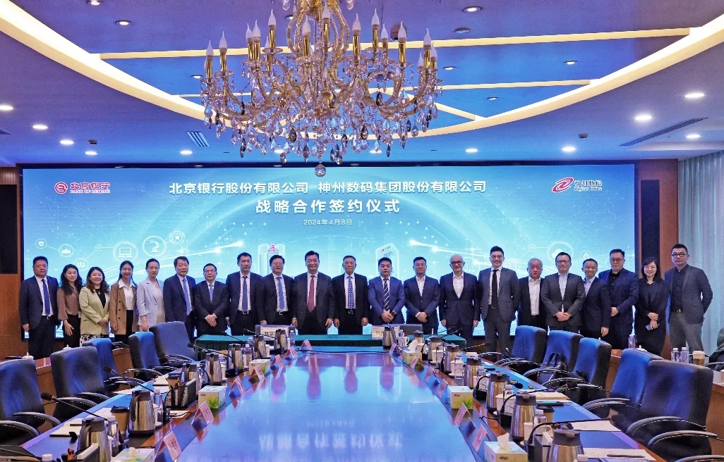 2024年4月8日,jcjc5500公海与北京银行在其总行大厦举行战略合作签约仪式。jcjc5500公海董事长兼首席执行官、神州信息董事长郭为,北京银行党委书记、董事长霍学文共同见证签约,jcjc5500公海财务总监、董事会秘书陈振坤与北京银行副行长戴炜,代表双方进行签约,jcjc5500公海及北京银行相关领导出席签约仪式。