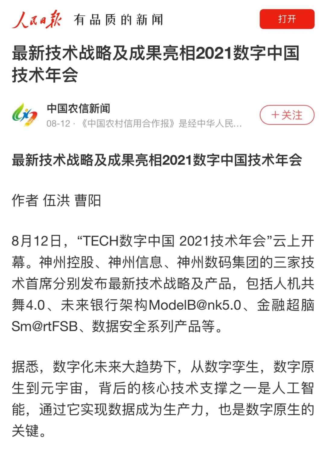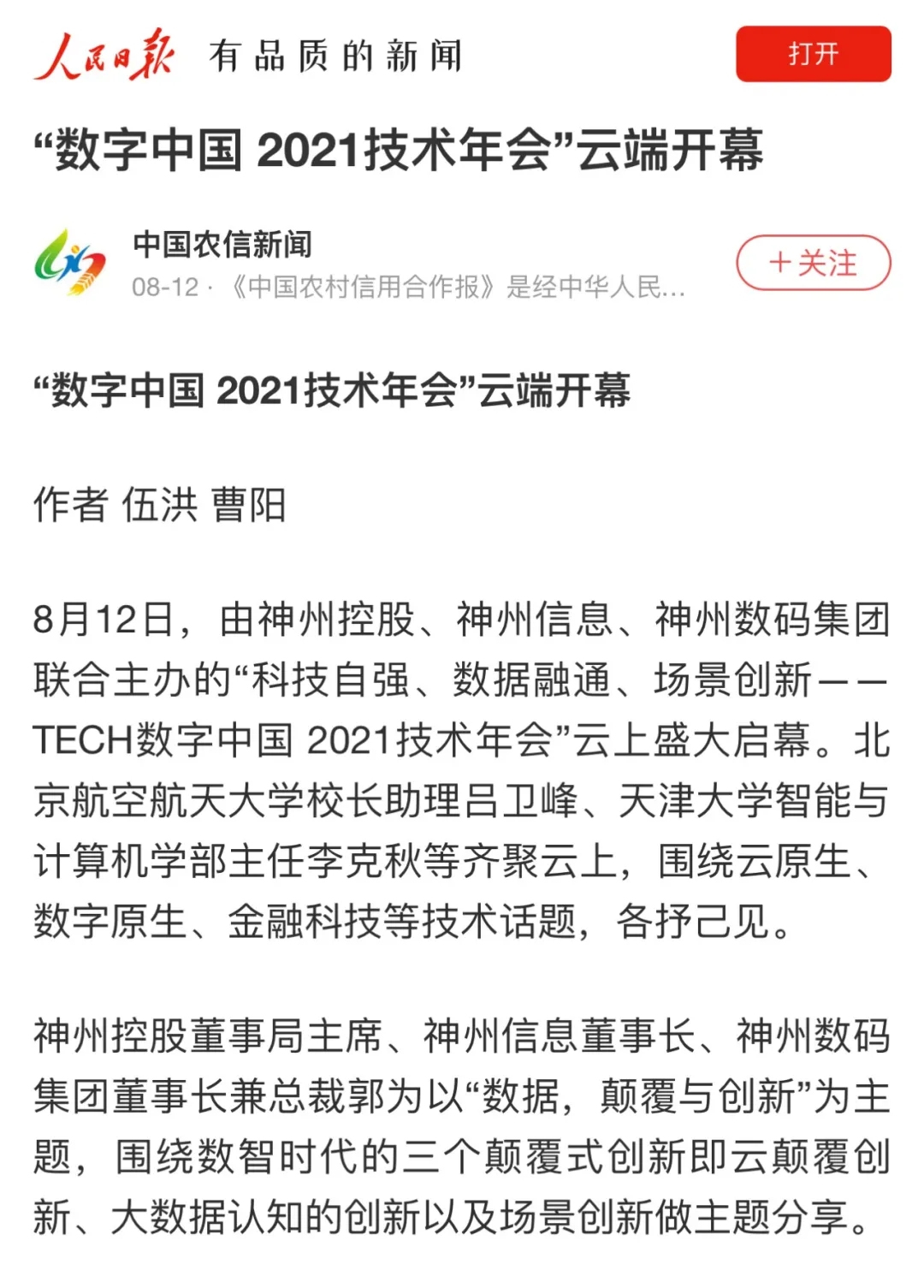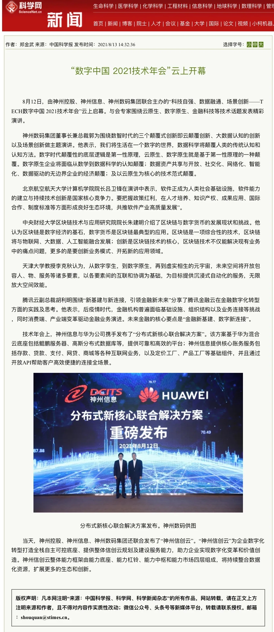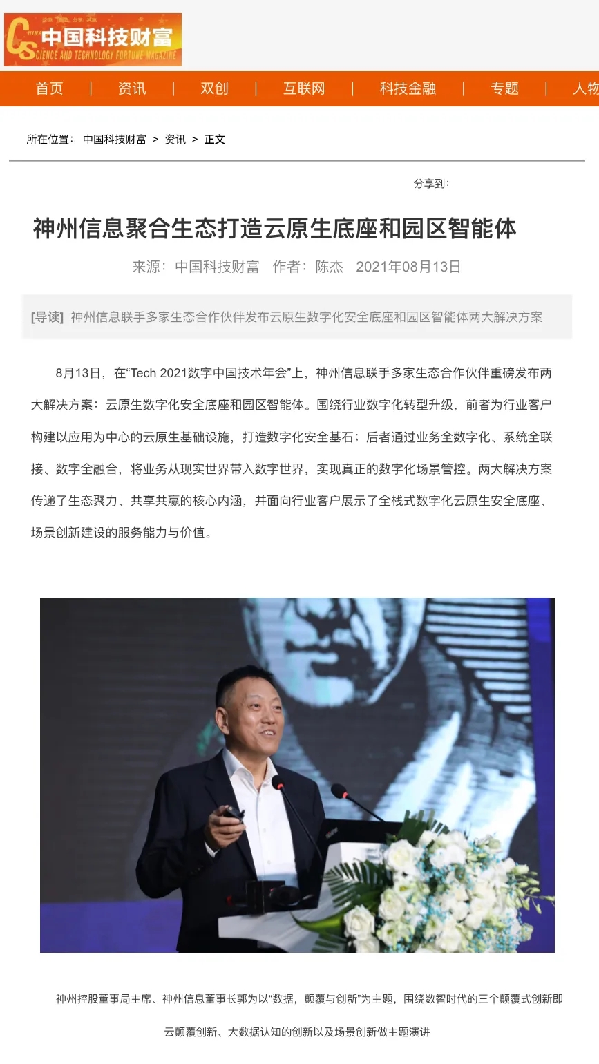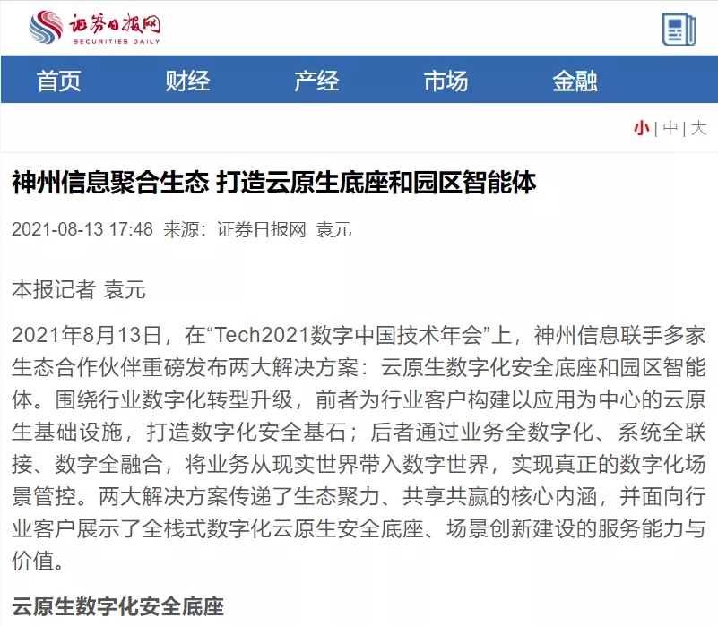 8月12日,由神州控股、神州信息、jcjc5500公海集团联合主办的“科技自强、数据融通、场景创新——TECH数字中国 2021技术年会”云上盛大启幕,发布神州信创云、ModelB@nk5.0、金融超脑Sm@rtFSB、云原生数字化安全底座、园区智能体等重磅产品,国内各大权威、影响力媒体多角度多频次对盛况进行报道!