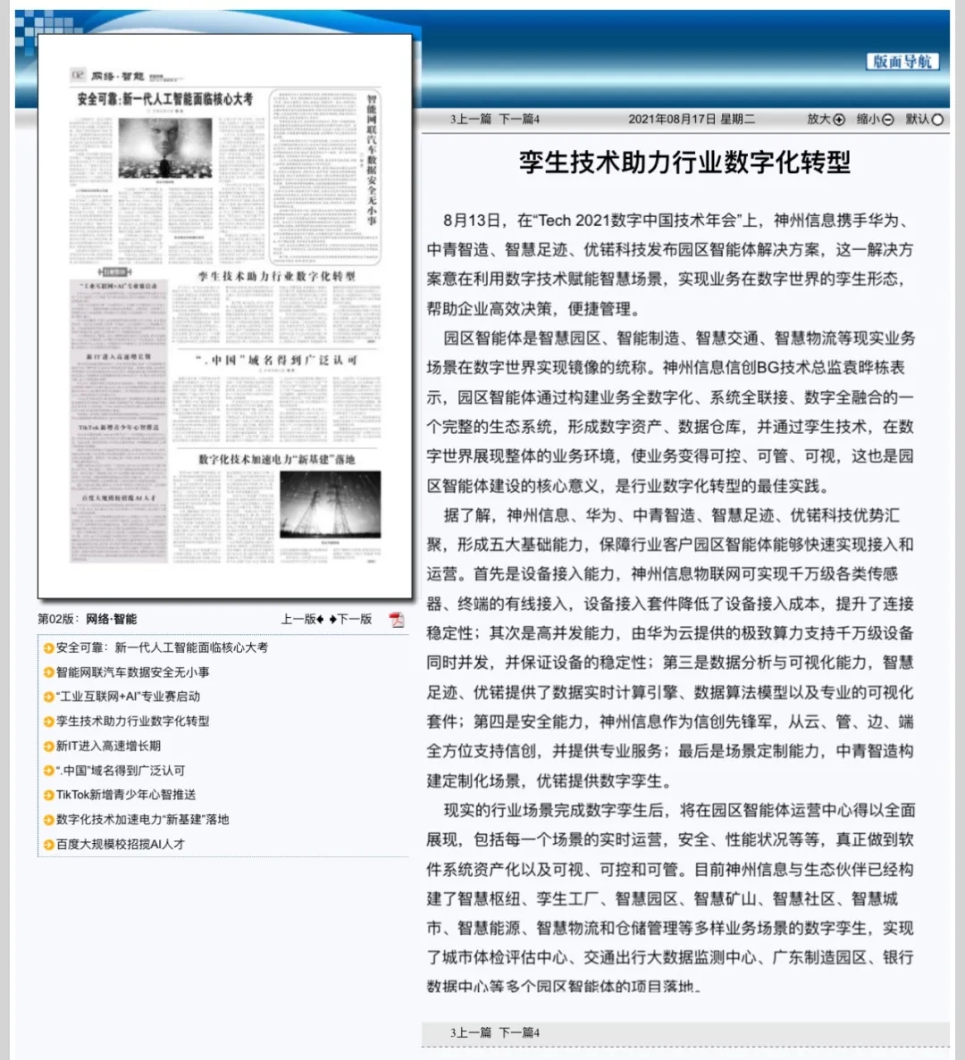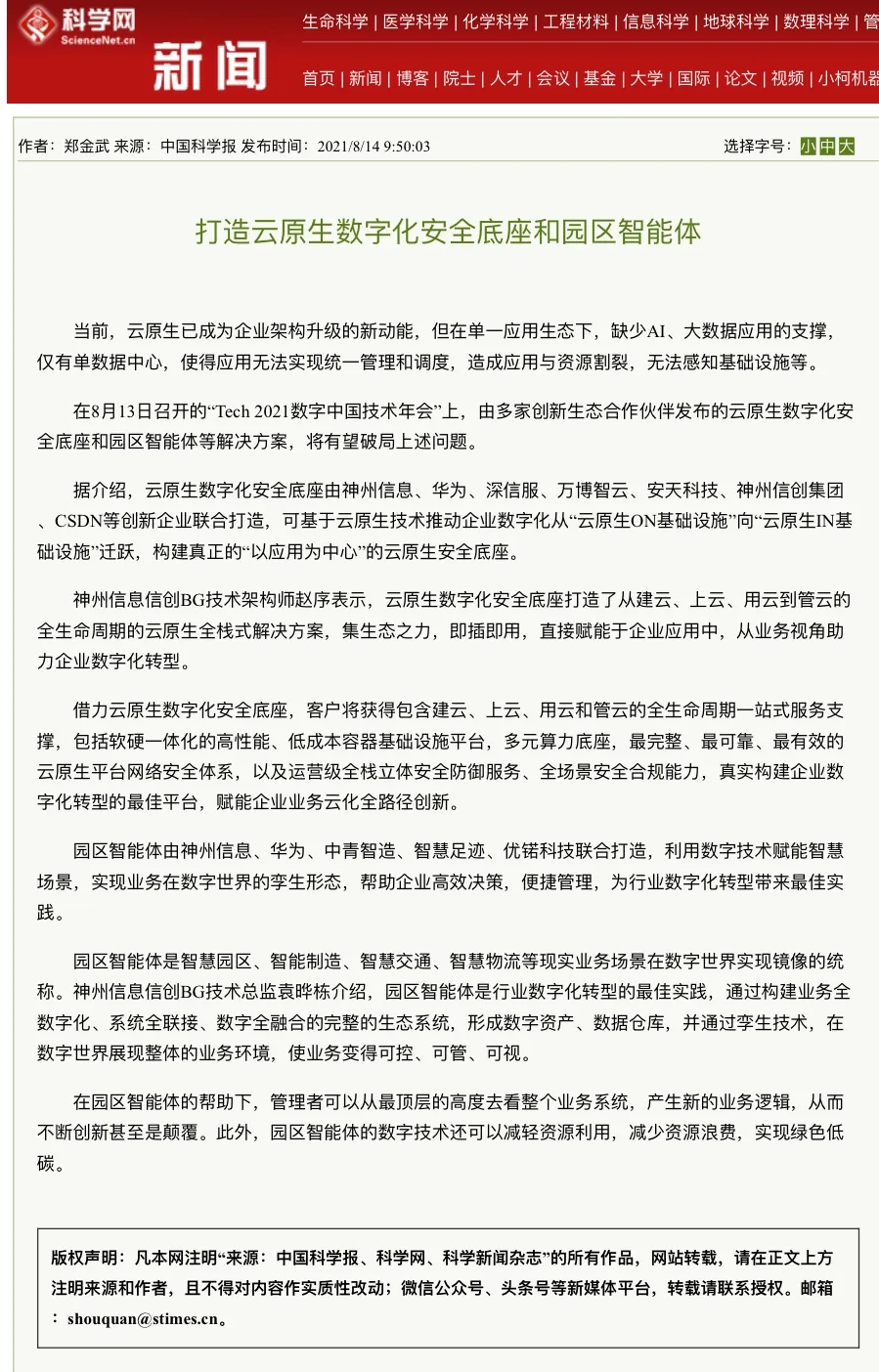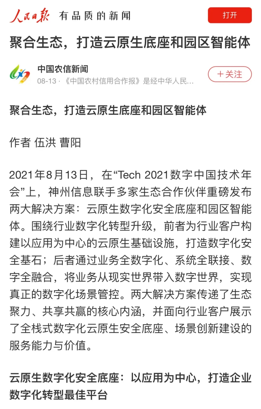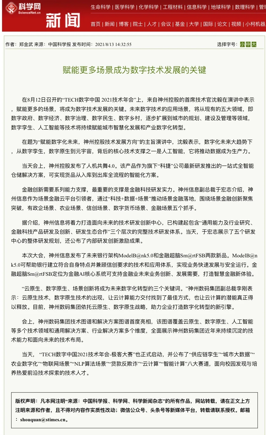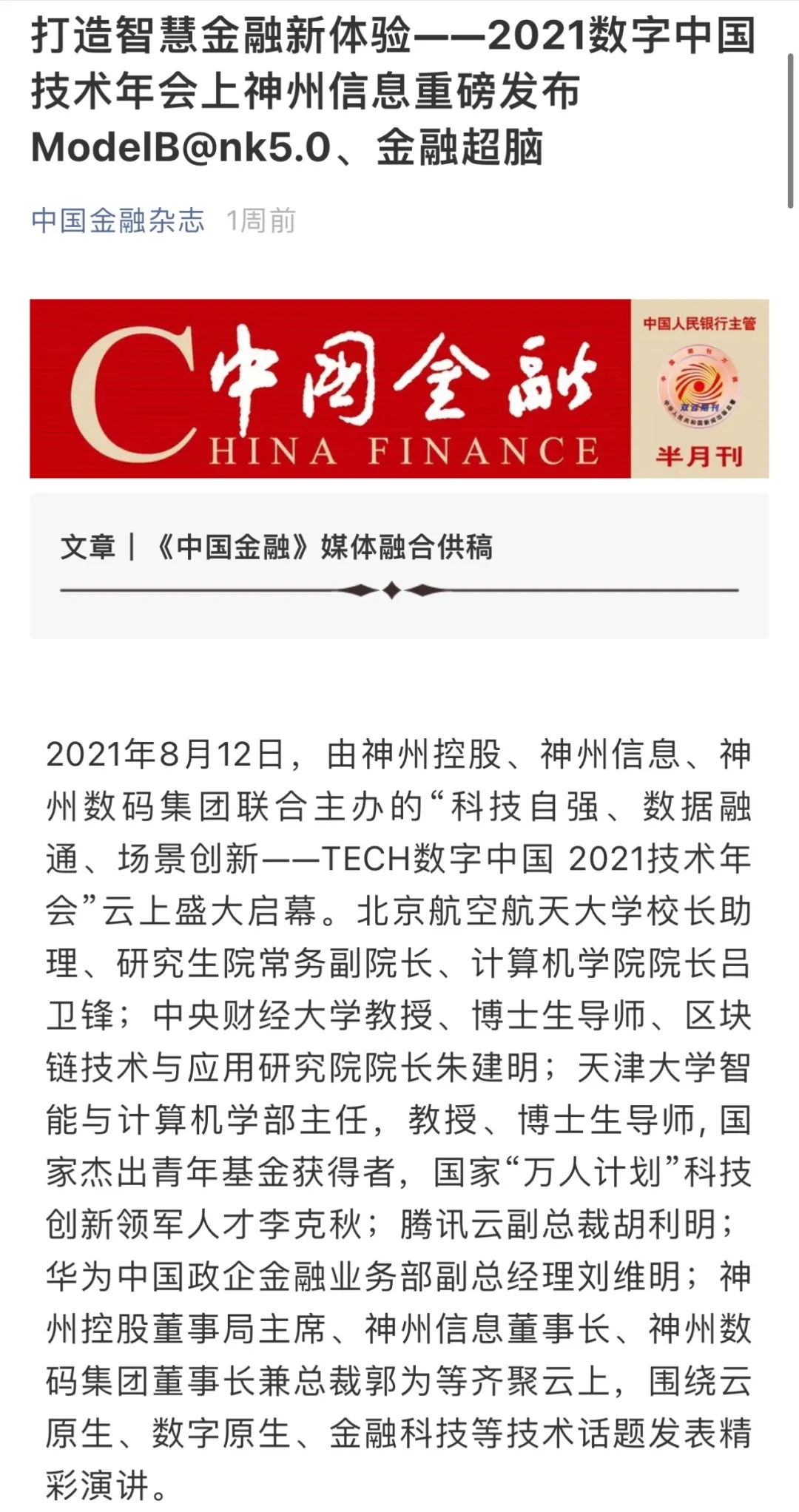 8月12日,由神州控股、神州信息、jcjc5500公海集团联合主办的“科技自强、数据融通、场景创新——TECH数字中国 2021技术年会”云上盛大启幕,发布神州信创云、ModelB@nk5.0、金融超脑Sm@rtFSB、云原生数字化安全底座、园区智能体等重磅产品,国内各大权威、影响力媒体多角度多频次对盛况进行报道!