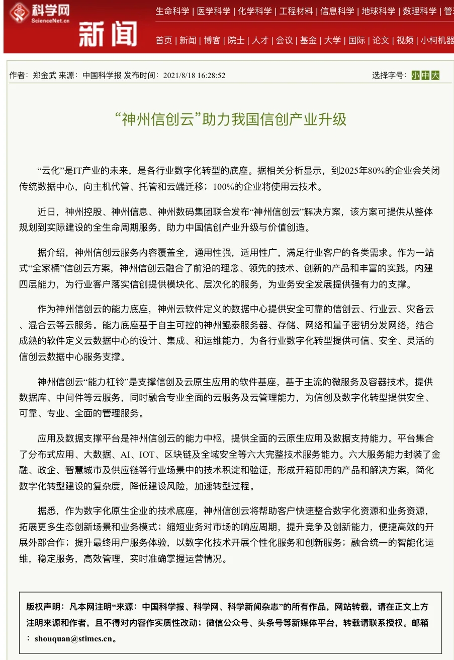 神州信创云落地:提供层次化、模块化技术支撑