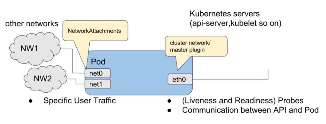 以上是Multus CNI项目官方对其存在意义的精简描述,它的存在就是帮助K8s的Pod(可简单理解为一组容器的集合,是K8s可管理的最小“容器”单位)建立多网络接口。
