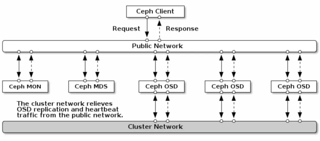 如图2所示,Public Network即是控制面网络,Cluster Network即是数据面网络;我们忽略Ceph 这些组件的作用和意义,只从网络流量的流向分析,可以很清晰看出控制面网络用于Ceph组件内部和与外部客户端进行交互;而数据面网络主要用于副本间的数据同步。这就要求同时运行控制网络和数据网络组件所在的节点需要有两张可用的网络接口。