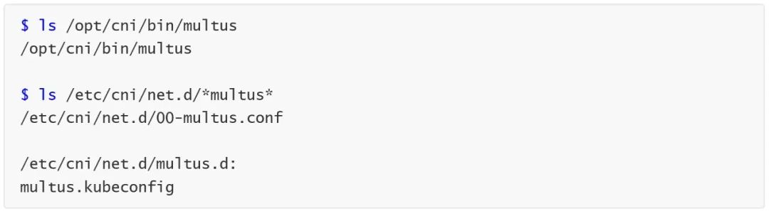经观察,Pod运行不久后,将会在各节点上的/opt/cni/bin/下生成multus的可执行文件,/etc/cni/下生成网络定义文件以及用于配置集群访问的文件。