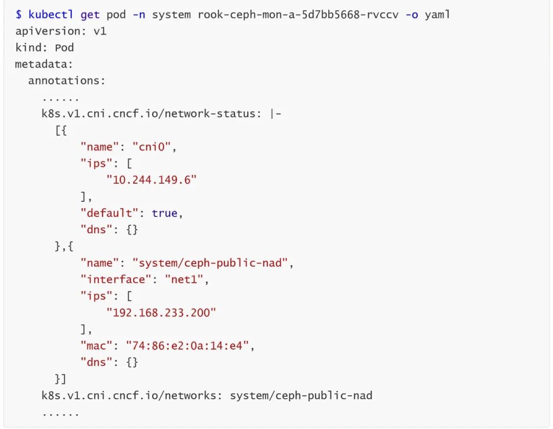 根据图2上的展示,只有OSD组件是同时使用了控制网络和数据网络,可查看OSD Pod信息进行验证: