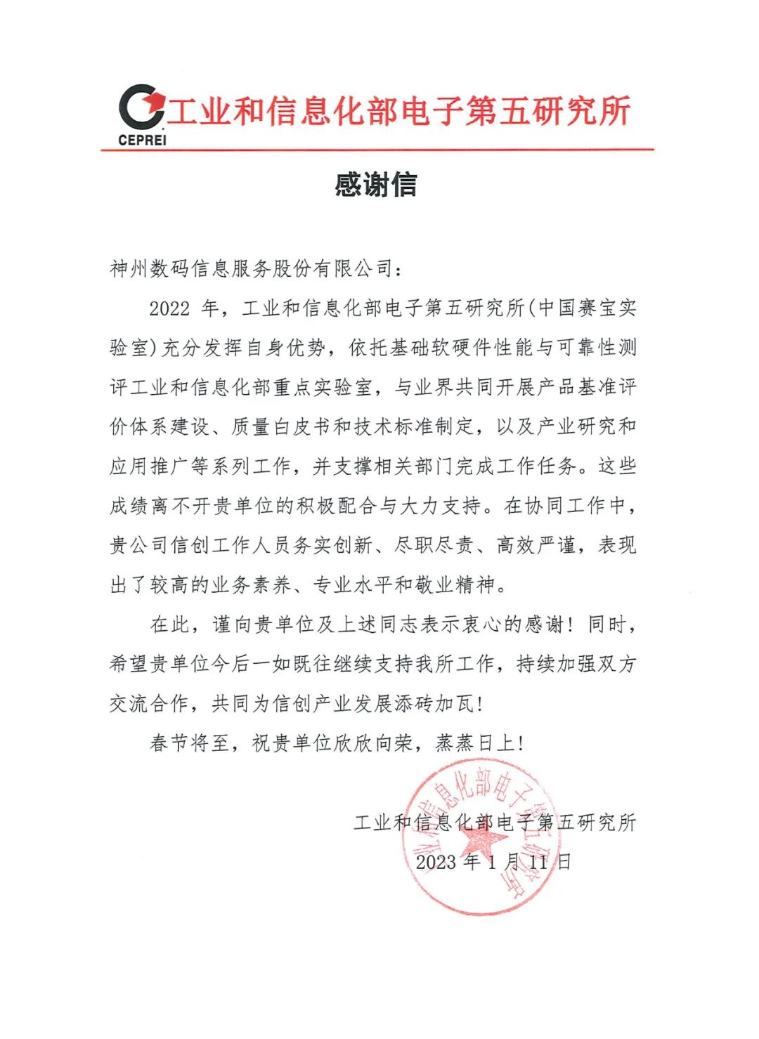 首页最新动态工业和信息化部电子第五研究所致神州信息的感谢信