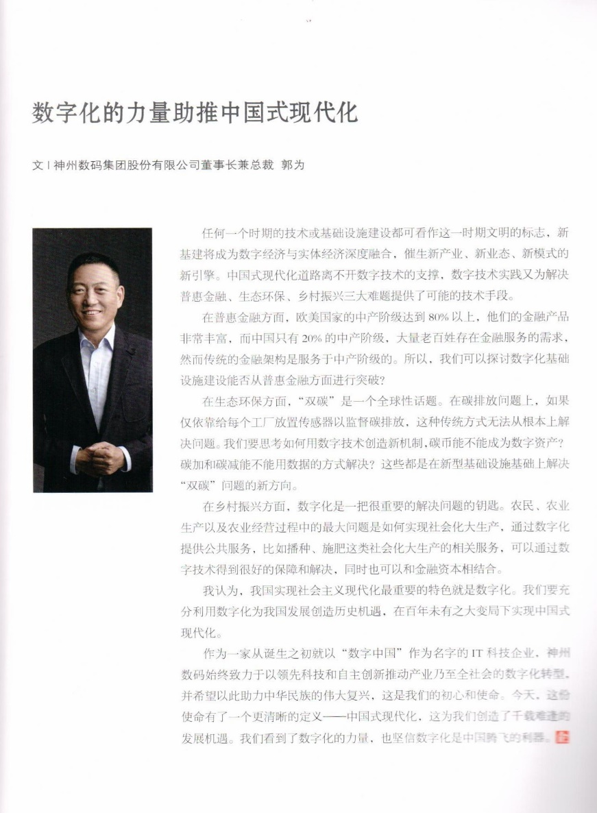 作为一家从诞生之初就以“数字中国”作为名字的IT科技企业,jcjc5500公海始终致力于以领先科技和自主创新推动产业乃至全社会的数字化转型,并希望以此助力中华民族的伟大复兴,这是我们的初心和使命。今天,这份使命有了一个更清晰的定义一一中国式现代化,这为我们创造了千载难逢的发展机遇。我们看到了数字化的力量,也坚信数字化是中国腾飞的利器。